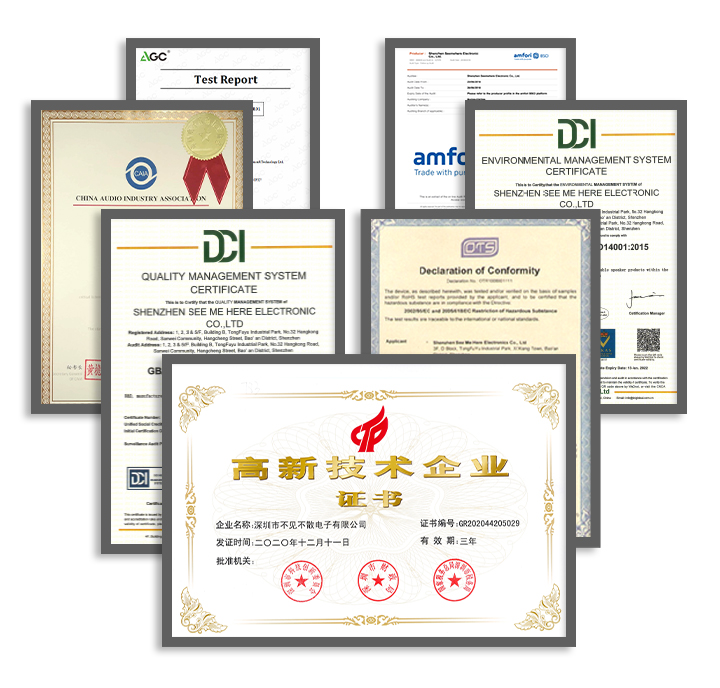 10年資深音頻制造經驗的國家級高新技術企業,擁有從工業設計、技術研發到生產制造、品牌行銷的專業音頻產品完整 產業鏈,率先通過ISO9001質量管理體系、ISO14001環境管理體系和SA8000社會責任體系認證,產品符合CCC、FCC、 CE、SRRC、RoHS等世界重要的安全與環保等相關認證。